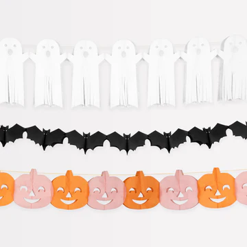 Nothing says Halloween likes ghosts, bats and pumpkins – and this sensational garland set has them all! Place them on the wall, in the porch, on the mantel, in the window or on your party table for scaretastic results. Pull them open to hang, then fold and pack away to be used year after year.
